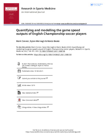 Connor, Mark, Mernagh, Dylan and Beato, Marco (2021) Quantifying and modeling the game speed outputs of English Championship soccer players. Research in Sports Medicine, 30 (2). pp. 169-181. ISSN 1543-8627