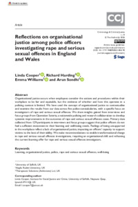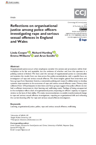 Maguire, Linda, Sondhi, Arun, Harding, Richard and Williams, Emma (2025) Reflections on organisational justice among police officers investigating rape and serious sexual offences in England and Wales. Criminology and Criminal Justice. ISSN 1748-8966