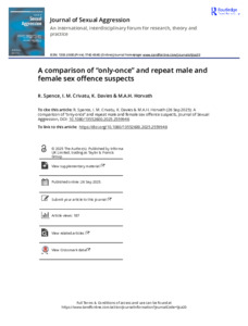 Spence, Ruth, Crivatu, Ioana, Davies, Kari and Horvath, Miranda (2025) A comparison of ‘Only-Once’ and repeat male and female sex offence suspects. Journal of Sexual Aggression. ISSN 1355-2600