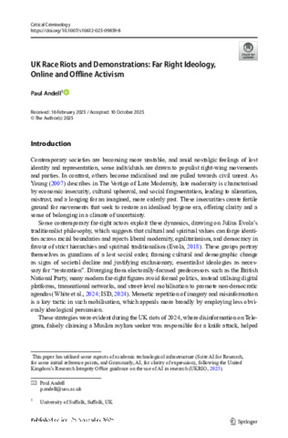 Andell, Paul (2025) UK race riots and demonstrations: far right ideology, online and offline activism. Critical Criminology. ISSN 1205-8629