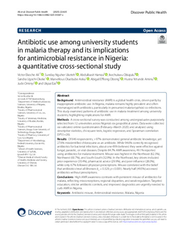 Ali, Victor Ekoche, Uketeh, Sunday Nguher, Hamza, Abdulbasit, Obiajulu, Ikechukwu, Okeke, Sandra Ugochi, Asika, Marvellous Oluebube, Obong, Abigail Effiong, Aminu, Husna Yetunde, Ominyi, Jude and Eze, Ukpai (2025) Antibiotic use among university students in malaria therapy and its implications for antimicrobial resistance in Nigeria: a quantitative cross-sectional study. Discover Public Health, 22 (635): 635. ISSN 3005-0774