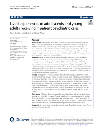 Nwedu, Aaron, Ominyi, Jude and Agom, David (2025) Lived experiences of adolescents and young adults receiving inpatient psychiatric care. Discover Mental Health, 5 (184): 184. ISSN 2731-4383