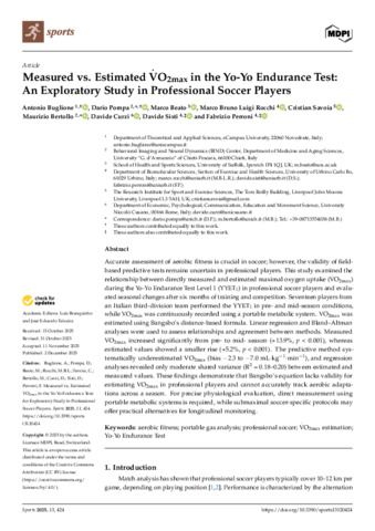 Buglione, Antonio, Pompa, Dario, Beato, Marco, Rocchi, Marco Bruno Luigi, Savoia, Cristian, Bertollo, Maurizio, Curzi, Davide, Sisti, Davide and Perroni, Fabrizio (2025) Measured vs. estimated V ˙ O 2max in the Yo-Yo Endurance Test: an exploratory study in professional soccer players. Sports, 13 (12): 424. ISSN 2075-4663