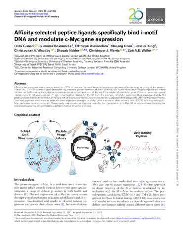 Guneri, Dilek, Rosonovski, Summer, Alexandrou, Effrosyni, Chen, Shuang, King, Jessica, Waudby, Christopher, A., Haider, Shozeb, Morris, Christoper, J. and Waller, Zoë, A, E. (2025) Affinity-selected peptide ligands specifically bind i-motif DNA and modulate c-Myc gene expression. Nucleic Acids Research, 53 (20). ISSN 0305-1048