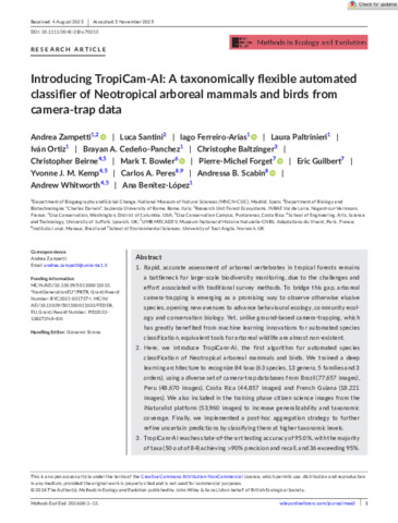 Zampetti, Andrea, Santini, Luca, Ferreiro‐Arias, Iago, Paltrinieri, Laura, Ortiz, Iván, Cedeño‐Panchez, Brayan A., Baltzinger, Christophe, Beirne, Christopher, Bowler, Mark, Forget, Pierre‐Michel, Guilbert, Eric, Kemp, Yvonne J. M., Peres, Carlos A., Scabin, Andressa B., Whitworth, Andrew and Benítez‐López, Ana (2026) Introducing TropiCam‐AI: a taxonomically flexible automated classifier of Neotropical arboreal mammals and birds from camera‐trap data. Methods in Ecology and Evolution. ISSN 2041-210X